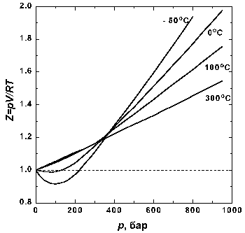 На рис. 1.2 представлены факторы сжимаемости для азота при разных температурах. По мере уменьшения температуры эффект межмолекулярного притяжения увеличивается (что проявляется в образовании минимума на кривых в области давлений около 100 бар). Минимум на кривых обнаруживается для всех газов, если температура достаточно низка. У водорода и гелия, имеющих очень низкие температуры кипения, этот минимум наблюдается только при температурах значительно ниже 0° C.