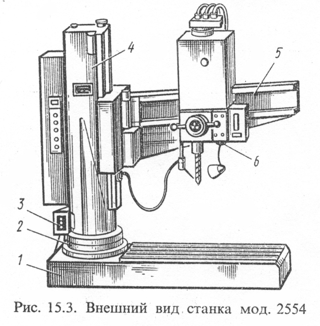 На рис.3 приведен внешний вид радиально-сверлильного станка мод. 2554. На фундаментной плите 1 установлена неподвижная колонна 2, на которую надета поворотная гильза 4. Последняя после поворота зажимается гидрозажимом 3 на колонне 2. На гильзе 3 имеются вертикальные направляющие, по которым перемещается траверса (рукав) 5.