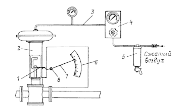 В мембранную полость через фильтр 5 и панель дистанционного управления 4 по трубке 3 подают сжатый воздух, давление которого измеряют образцовым манометром (давление сжатого воздуха перед редуктором должно составлять 150…200 кПа). Изменяя натяжение регулировочной пружины, добиваются полного хода затвора при изменении давления воздуха в мембранной полости в рабочих пределах.