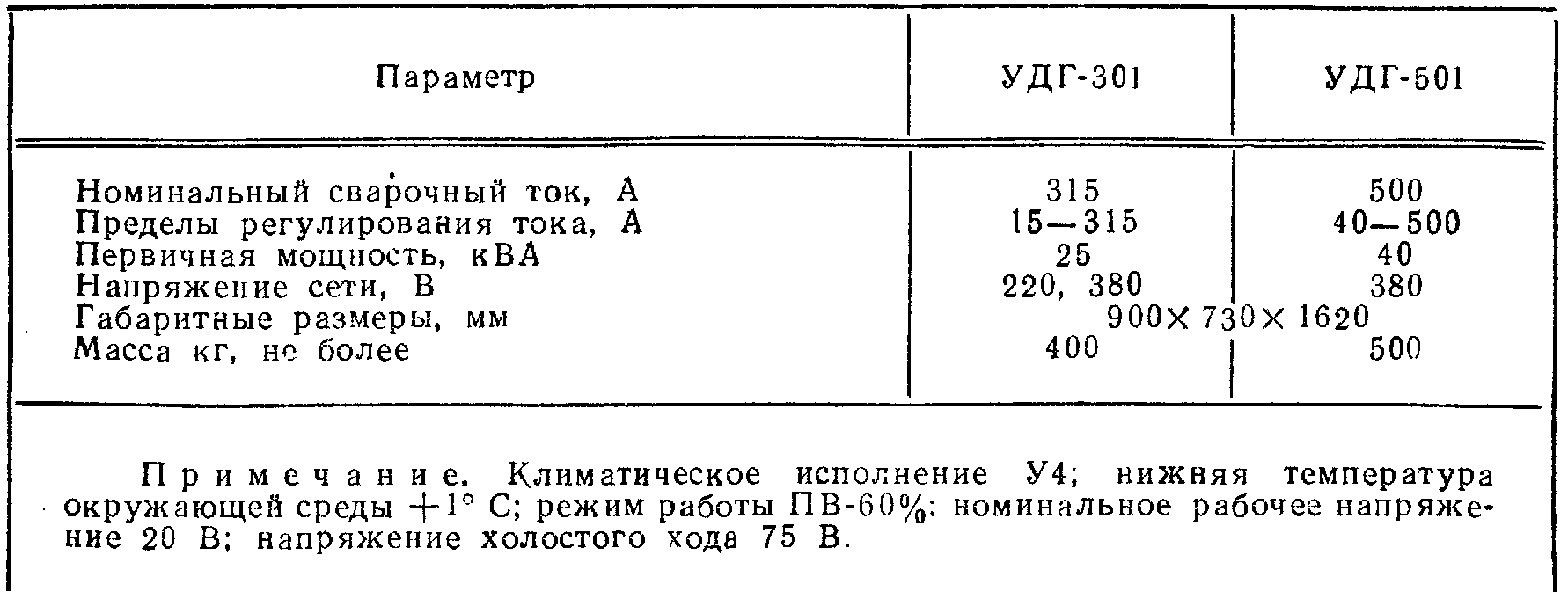 Установки УДГ-301 и УДГ-501 рассчитаны на повторно-кратковременный режим работы при принудительном воздушном охлаждении. Сварка производится однофазным переменным током неплавящимся вольфрамовым электродом в среде аргона. Техническая характеристика установки УДГ-301 и УДГ-501 приведена в табл., а горелок установок УДГ - в табл.2.
