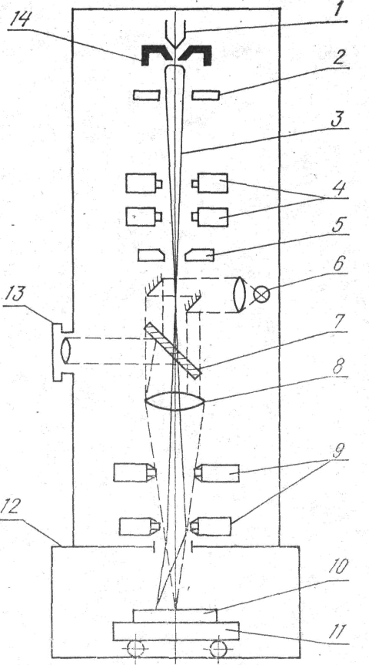 Электронно-лучевая обработка основана на использовании энергии потока направленных электронов для формирования поверхностей деталей путем нагрева, плавления и испарения материала в зоне обработки. Для обработки материалов электронным лучом используются специальные установки, в которых формируются мощные направленные пучки электронов. Принципиальная схема такой установки приведена на рис.8.3. Основными ее элементами являются катодный узел и системы фокусировки и перемещения луча (детали). Электронная пушка состоит из подогревного катода 1, фокусирующего электрода 14 и ускоряющего анода 2. Пучок электронов 3, испускаемых поверхностью нагретого катода 1, собирается в узкий луч фокусирующим электродом 14 и ускоряется разностью потенциалов между анодом 2 и катодом 1. Для сужения электронного пучка до необходимых размеров используются электростатические и электромагнитные линзы 4 и диафрагма 5. Пройдя через них, луч попадает на обрабатываемую деталь 10, укрепленную на рабочем столе 11. Обработка выполняется в камере 12, в которой создается глубокий вакуум (133∙10-6 Па). Наблюдение за процессом обработки проводится с помощью оптической системы 8, окуляра 13, полупрозрачного зеркала 7 и подсветки 6.