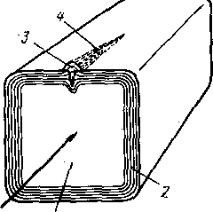 Магнитные частицы порошка, попадая в поле дефекта под действием электрического тока 7, намагничиваются и в результате притягивающей сипы перемещаются в зону наибольшей неоднородности магнитного поля. Порошинки, притягиваясь друг к другу, выстраиваются в цепочки, ориентируясь по магнитным силовым линиям поля 2, и, накапливаясь, образуют характерные рисунки в виде валиков 3, по которым судят о наличии дефекта 4.