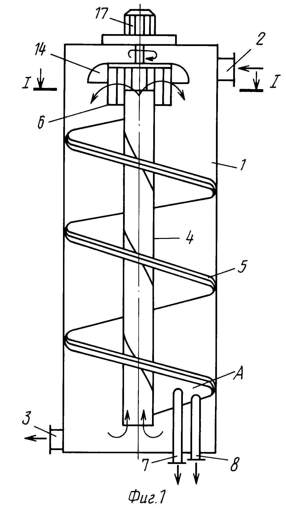 1. Устройство для концентрирования жидких пищевых продуктов, содержащее секционированный корпус, размещенный в нем на полом приводном валу перфорированный цилиндрический ротор, перфорация которого имеет вид сопел Лаваля, охватывающий ротор статор с каналами подачи газообразного теплоносителя, патрубок подачи продукта, сообщенный с полостью вала, выхлопной патрубок, сообщенный с полостью ротора, и патрубки подачи газообразного теплоносителя и отвода концентрата, сообщенные с разными секциями корпуса, отличающееся тем, что ротор снабжен по меньшей мере одной внутренней перфорированной цилиндрической обечайкой, установленной с образованием гидравлического затвора относительно одного из его торцов.