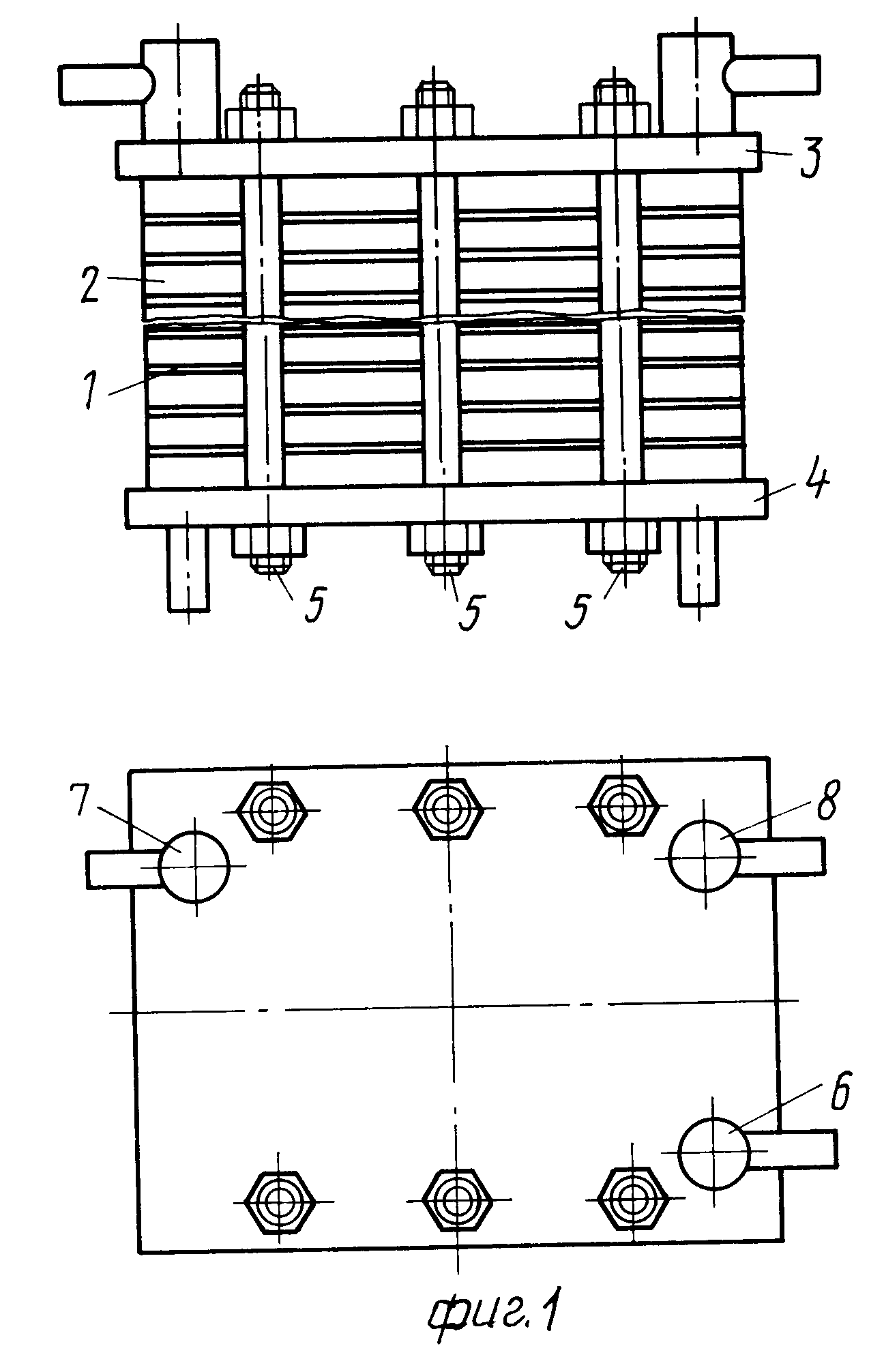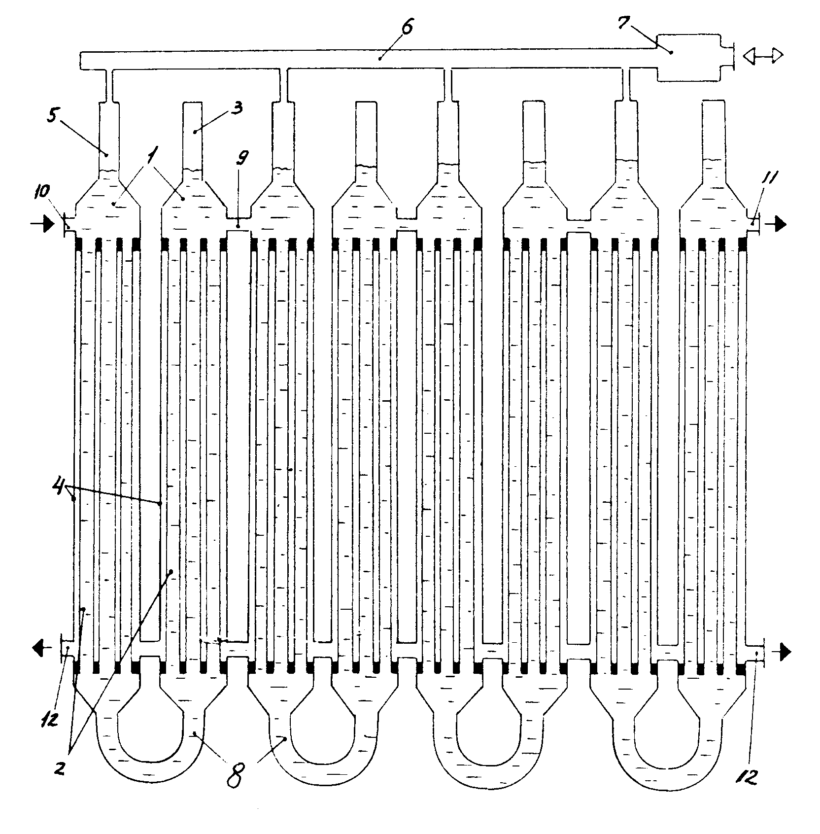 Мембранный аппарат трубчатого типа предназначен для разделения жидких и газовых сред и обеспечивает повышение надежности и упрощение эксплуатации. Мембранный аппарат состоит из цилиндрического корпуса и пучка трубчатых мембранных элементов, одни концы которых закреплены в опорной трубной решетке, а другие (заглушенные) - зафиксированы в распределительной трубной решетке, двух торцевых крышек со штуцерами для подачи разделяемой среды и отвода пермеата и уплотнительных элементов. Обе трубные решетки жестко соединены между собой опорным стержнем, воспринимающим нагрузки, воздействующие на пучок мембранных элементов при сборке (разборке) аппарата и регенерации мембранных элементов вне аппарата. Простота введения в корпус и фиксации в нем пучка мембранных элементов упрощает установку (снятие) мембранных элементов и снижает вероятность повреждения элементов, мест их закрепления в опорной трубной решетке и селективных слоев. Наличие и выполнение соответствующим образом центрального и периферийного обтекателей, а также равномерное расположение каналов для подачи разделяемого потока вокруг каждого мембранного элемента обеспечивает оптимальное распределение потока относительно всех мембранных элементов. Минимальное число уплотнительных элементов и размещение их в замке (пазу) повышает герметичность камер и полостей аппарата. 5 з.п. ф-лы, 3 ил.
