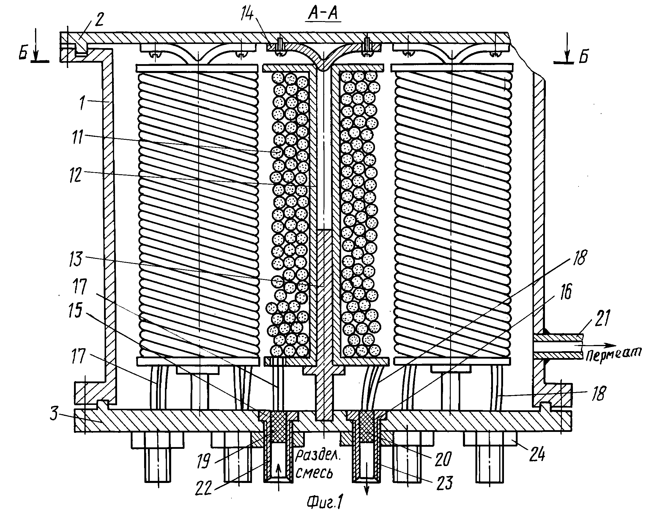 Изобретение относится к устройствам для осуществления мембранных процессов методом испарения через мембрану и может быть использовано в любой отрасли промышленности, где производится разделение жидких сред. Цель изобретения - интенсификация процесса разделения смеси путем подвода теплоты в зону массообмена. Мембранный аппарат состоит из корпуса, в котором расположены закрепленные в S-образной распорке гофрированные перегородки, свернутые в спираль и образующие две спиральные камеры для противоточного движения разделяемой смеси и горячего теплоносителя. В первой камере располагаются мембраны из полого волокна, открытые концы которых выходят в камеру для сбора пермеата. Подлежащая разделению нагретая смесь протекает по спиральной камере, дополнительно подогреваясь по всей ее длине горячим теплоносителем, и разделяется на мембране. Легкопроницающий компонент по внутреннему каналу полого волокна отводится в сборник пермеата и удаляется. Концентрат отводится из спиральной камеры через соответствующий патрубок. Конструкция аппарата позволяет одновременно выделять из смеси несколько компонентов, используя в одном модуле мембраны различных типов и несколько сборников пермеата для отдельных компонентов.