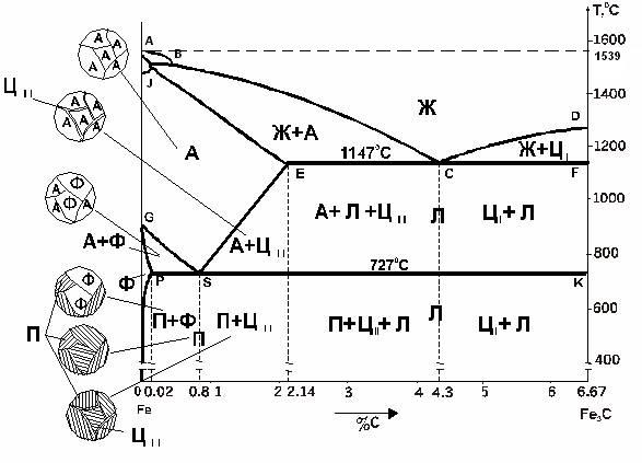 Рисунок 1.Диаграмма состояния (фазового равновесия) железо-цементит(Fe-Fe3C)