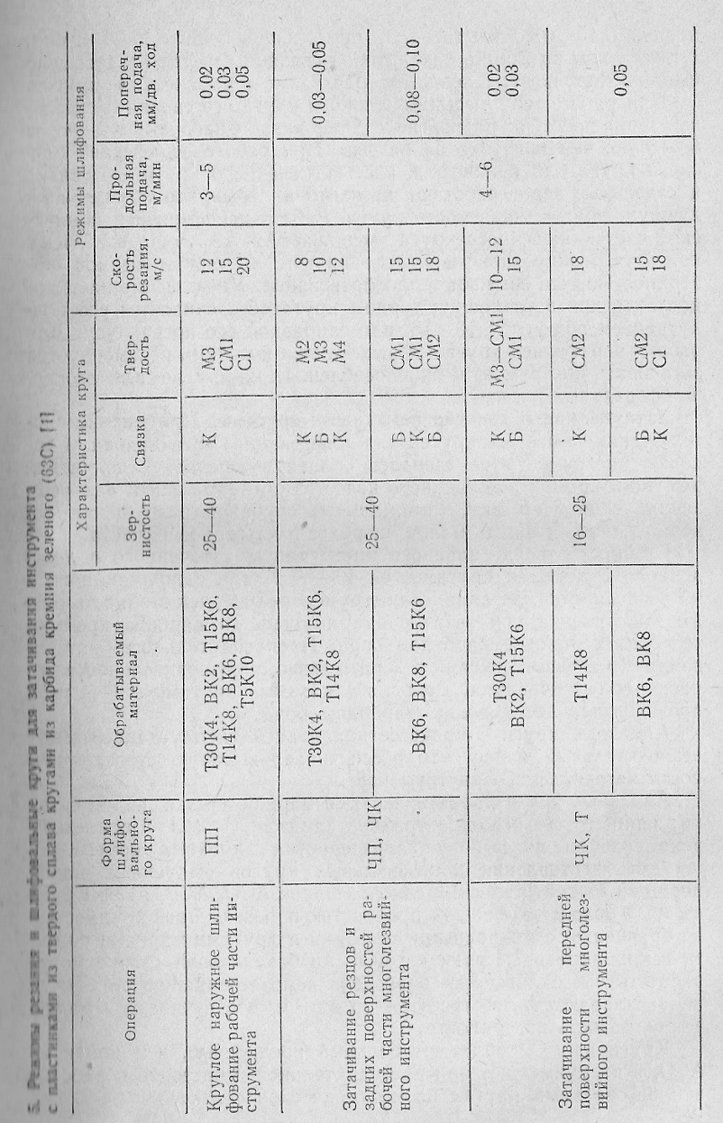 При затачивании твердосплавного инструмента шлифовальными кругами из карбида кремния (63С) рекомендуется скорость резания снижать до 8-15 м/с и поперечную подачу До 0,01 - 0/03 мм/дв. ход. При затачивании твердосплавного инструмента рекомендуется применять более мягкие круги, чем для затачивания инструмента из стали. Твердость кругов для вольфрамовых сплавов СМ1-СМ2, для титановых М2-МЗ.