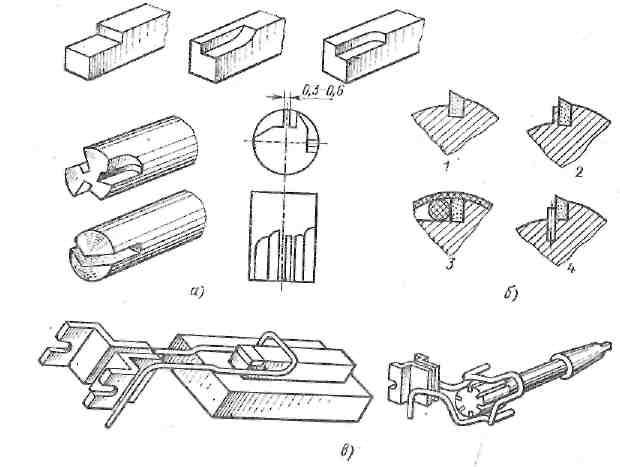а - форма пазов под пластины; б - предварительное крепление пластин; 1 - кернованием; 2 - технологическими стенками; 3 - обвязка асбестовым шнуром; 4 - технологическим штифтом; в - петлевые индукторы для запаивания пластин из твердого сплава