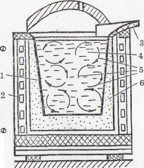 Шихта через загрузочные окна 1 загружается в плавильное пространство 2, выложенное огнеупорным кирпичом. Природный газ и воздух, образующие факел для расплавления