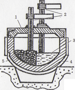 Дуговая электрическая печь (рис, 4) состоит из стального кожуха, футерованного огнеупорным кирпичом. Сверху через отверстия в своде печи введены угольные электроды, Шихта загружается через загрузочное окно 1. Шихта плавится под воздействием высокой температуры, создаваемой электрической дугой, возникающей при прохождении электрического тока между электродами 2 и шихтой 3. Готовую сталь выпускают по желобу летки 4 при наклоне печи, осуществляемом с помощью поворотного механизма 5.