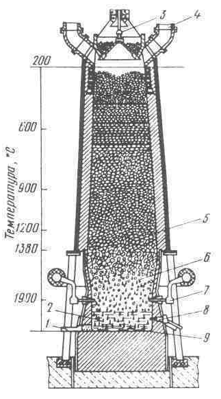 При температуре выше 900оС происходит быстрое науглероживание железа. При 1147оС начинается образование жидкого чугуна расплавление пустой породы и флюсов с образованием шлаков, более легких чем чугун. Расплавленный чугун 9 стекает вниз печи, а расплав шлака 2, как более легкий, находится сверху чугуна. Чугун и шлак периодически выпускают через летки 1 и 8 в ковш. На каждую тонну чугуна получается около 0,6 т огненно-жидкого шлака.
