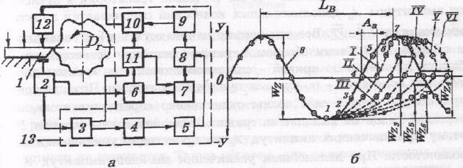 Способ был реализован применительно к токарным операциям при обтачивании наружных поверхностей проходными резцами. Наиболее вероятным видом колебаний резца в этом случае являются автоколебания, развивающиеся на частоте собственных колебаний резца. Численно частота собственных' колебаний резца в этом случае составляет тысячу и более герц. Соответственно велика скорость колебаний, поэтому должен быть надежный и быстродействующий двигатель дополнительных перемещений резца с тем, чтобы успеть за такой частотой. В качестве такового выбран электродинамический вибратор (А.с. 147412, БИ 10, 1962, смотри приложение) 12 (рис.1,а), касающийся наконечником головки резца 1. В качестве источника информации используют естественно развивающиеся колебания самого резца, измеряемые бесконтактным двухкоординатным датчиком перемещений (А.с. 1319334, БИ 18, 1960, смотри приложение). Вибратор 12 управляется адаптивной системой управления (А.с. 593192, БИ 6, 1972, смотри приложение), содержащей устройство 3 фазовой подстройки частоты, анализатор экстремума 6, на которые поступает сигнал датчика перемещений 2. Сигнал возникает вследствие анизотропии свойств элементов системы ЗИПС, в том числе заготовки и инструмента. Сигнал через управляемый генератор 4 и фазовращатель 5, сдвигающий фазу на 180°, подается на исполнительное устройство 8, усилитель 9 и ключ 10. Работой ключа 10 управляет устройство 11. Динамический вибратор 12 сердечником ударяет по инструменту 1. Происходит тангенциальный сдвиг ТОД, в результате которого изменяется траектория колебаний резца, изменяется профиль волнистости, образующейся на поверхности заготовки.