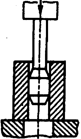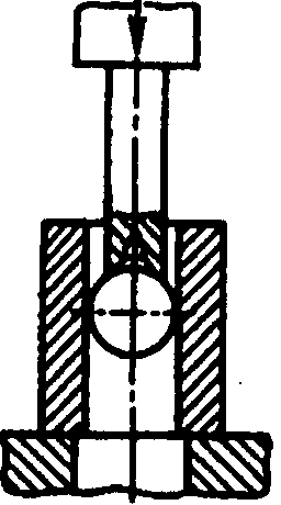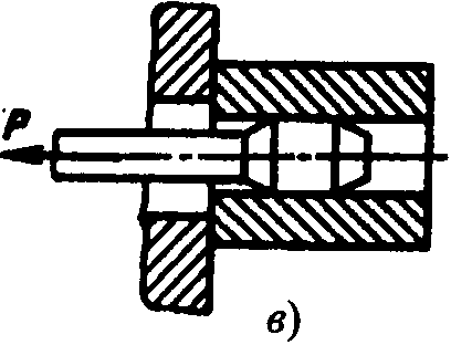 Простейшим инструментом служит шарик, который проталкивается штоком (рис. 2, а). Роль инструмента может выполнять также оправка-дорн (рис. 2, б), к которому прикладывается сжимающая или растягивающая (рис. 2, в) сила. Заготовки обрабатываются за один или несколько ходов инструмента. Заготовки обрабатывают с малыми либо большими натягами. В первом случае зона пластического деформирования не распространяется на всю толщину детали. Так обрабатывают толстостенные заготовки. Во втором случае зона пластического деформирования охватывает всю деталь. Этот вариант обработки используют для тонкостенных деталей, что существенно повышает их точность. Шарики как инструмент не обеспечивают оптимальных условий деформирования и имеют малую стойкость. Калибрующие оправки выполняют одноэлементными, многоэлементными или сборными. Каждый из элементов-поясков имеет свой размер. Деформирующие элементы изготовляют из твердого сплава или стали, закаленных до высокой твердости. В качестве смазочного материала для сталей и бронз применяют сульфофрезол, для чугунов - керосин. Разработаны специальные смазочные материалы, обеспечивающие жидкостное трение. Они снижают рабочее усилие оборудования, способствуют повышению качества поверхностных слоев, увеличивают точность обработки и стойкость инструмента. Отверстия калибруют на прессах (рис. 2, а, б) или горизонтально-протяжных станках (рис. 2, в). Для правильного взаимного расположения инструмента и заготовки обычно применяют самоустанавливающиеся приспособления с шаровой опорой. Заготовку не закрепляют.