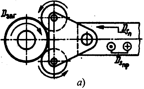 Накатывание цилиндрических (рис. 4, г) и конических мелкомодульных колес в 15 ... 20 раз производительнее зубонарезания. Процесс можно осуществлять на токарных станках накатниками 6 и 7, которые закреплены на суппорте и перемещаются, совершая движение Dsпр . Каждый накатник имеет заборную часть для постепенного образования накатываемых зубьев на заготовке 2.