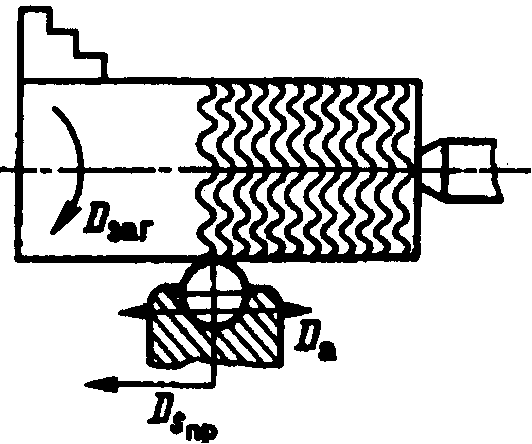 Для повышения износостойкости деталей машин на поверхностях трения целесообразно выдавливать слабозаметные, прилегающие друг к другу канавки. В канавках скапливаются смазочный материал и мелкие частицы, образовавшиеся в процессе изнашивания. Канавки образуются вибронакатыванием. Упрочняющему элементу - шару или алмазу, установленному в резцедержателе токарного станка, помимо движения Dsпр (рис.3) специальным устройством сообщают дополнительные движения алмаза Da с относительно малой амплитудой. Изменяя Dзаг, Dпр, амплитуду и частоту колебаний, можно на обрабатываемой поверхности получить требуемый рисунок. Распространение получили рисунки с непересекающимися канавками, с не полностью пересекающимися и со сливающимися канавками. Возможно также вибронакатывание внутренних и плоских поверхностей. Канавки одновременно упрочняют поверхность. Важнейшей характеристикой такой поверхности является общая площадь канавок (в процентах от номинальной площади обрабатываемой поверхности). Такие отклонения для каждого типа рисунка определяют аналитически.