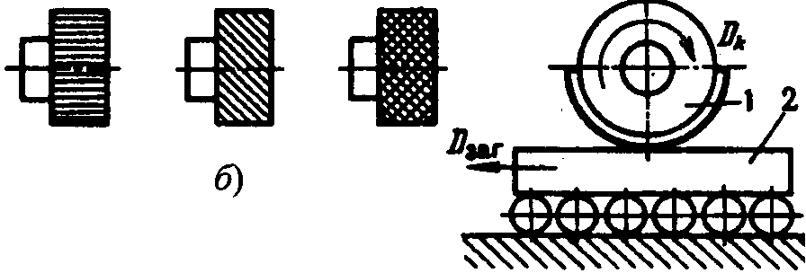 На рис. 5, а приведена схема накатывания рифленой поверхности. Заготовку закрепляют на токарном станке, на суппорте которого установлена державка с одним или двумя накатными роликами. Ролики внедряются в поверхность заготовки (Dsп ) и перемещаются вдоль заготовки с движением Dsпр. Вид рифлений (рис. 5, б) определяется характером зубчиков на роликах. Крестовое рифление производят двумя роликами, один из которых имеет правое направление отпечатывающих зубчиков, а другой - левое. Оба ролика вращаются на осях самоустанавливающейся державки. Для накатывания клейм (рис. 5, в) на накатнике J располагают негативно выступающие знаки. Заготовку 2 устанавливают на ролики для более легкого перемещения в момент накатывания.