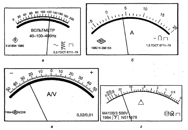 величины х;0,02/0,01 — для приборов, у которых измеряемая величина не может отличаться от значения х, показанного указателем, больше, чем на [ С + d (| Х>к>/>х>\ - 1)]%, где С и d — числитель и знаменатель соответственно в обозначении класса точности; Х>к> - больший (по модулю) из пределов измерений прибора. Примеры обозначения классов точности приведены на рис. 1
