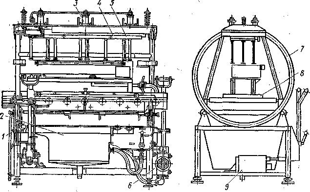 На неподвижной раме 1 (рис. 1) установлены поворотная рама 7, ванна 2 для воды, гидравлическое прижимное устройство, ручной насос 6 для воды, нажимная плита 4, прижимная плита 5, подставка 8 для блока или головки цилиндров, ручной насос 9 прижимного устройства. Поворотная рама 7 имеет возможность поворачиваться на 270° в обе стороны от среднего положения с фиксацией через 30°. На поворотной раме имеется рольганг, служащий для облегчения подачи и установки подставок с испытуемыми блоками или головками цилиндров. В верхней части поворотной рамы размещены гидроцилиндры 3 прижимного устройства, к которым шарнирно подвешена нажимная плита 4, в направляющих которой устанавливается прижимная плита 5, перекрывающая отверстия в блоке или головке цилиндров во время работы стенда. Рабочая жидкость — вода — подается в испытуемое изделие ручным насосом 6. Прижимные гидроцилиндры 3 развивают рабочее усилие прижима с помощью ручного насоса 9, наполненного тормозной жидкостью. Для слива воды из полостей испытуемых блоков и головок цилиндров и забора ее для подачи в систему служит ванна 2, имеющая сливную горловину для отвода воды в канализацию. Уровень в ванне поддерживается с помощью переливной трубы. Давление в гидросистемах контролируется манометрами. Работа на стенде производится следующим образом. Блок или головка цилиндров устанавливается на соответствующую подставку и по рольгангу подается до упора на поворотной раме. При этом на блок или головку цилиндров устанавливается заглушка или соединительный фланец, в зависимости от способа подачи воды в рубашку охлаждения испытуемого изделия. Затем с помощью насоса прижимного устройства прижимной плитой закрывают отверстия рубашки охлаждения на привалочной плоскости изделия и подают в нее воду. Предварительно открывают игольчатый кран на прижимной плите для выпуска воздуха из полости испытуемого изделия. После осмотра испытуемого изделия, находящегося под рабочим давлением, сбрасывают давление, сливают воду и снимают испытуемое изделие со стенда.