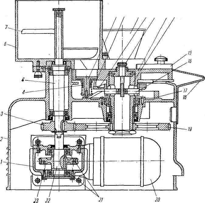 Внутри литого алюминиевого корпуса 2 (рис.2) находится привод, представляющий собой электродвигатель 20, прифланцованный к червячному редуктору / и понижающий число оборотов с 1400 до 37 в минуту. Вал редуктора 22, вращающийся в шарикоподшипниках 21, получает движение от червячного колеса 23 и передает его шестерне 3 и валу 5, на котором закрепляется лопастный винт 7. Лопастный винт вращается в неподвижном бункере 6 и направляет котлетную массу к отверстию в его днище.