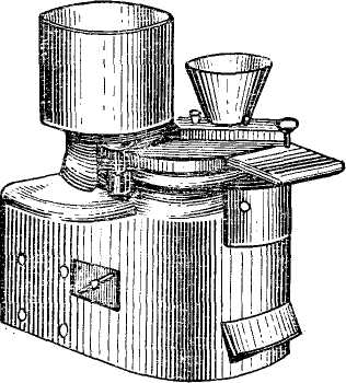 Принцип работы машины. Вращающийся формующий стол поочередно подводит ячейки с поршнями под бункер с сухарями, бункер с котлетной массой и к сбрасывателю. При этом"опорные винты хвостовиков поршней перемещаются по кулачку, который расположен таким образом, что участок с промежуточной высотой находится под бункером для сухарей, участок с минимальной высотой - под бункером с котлетной массой, а участок с максимальной высотой - у сбрасывателя.