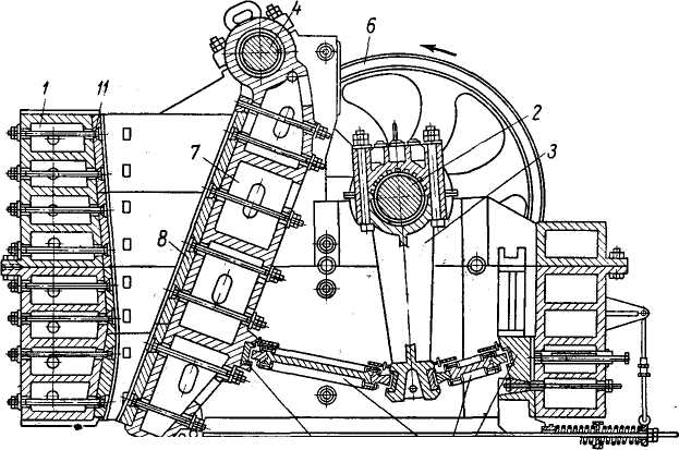 1) Щековые дробилки (рис 1), в которых раздавливание происходит между неподвижной 1 и подвижной 7 щеками в результате периодического нажатия; в отдельных конструкциях раздавливание сочетается с истиранием. При сложном движении щеки происходит повышенный износ дробящих плит и образование большого количества мелочи, идущей в отход