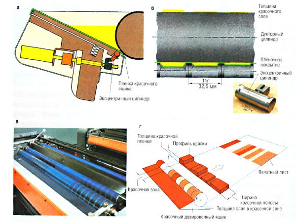 Рис. Красочный ящик СРС с зональной, свободной от побочного действия регулировки подачи краски: красочный ящик (а), регулируемый эксцентрик и дукторный цилиндр (б), красочный ящик в красочной секции (в), схема зональной подачи краски (Heidelberg) (г)