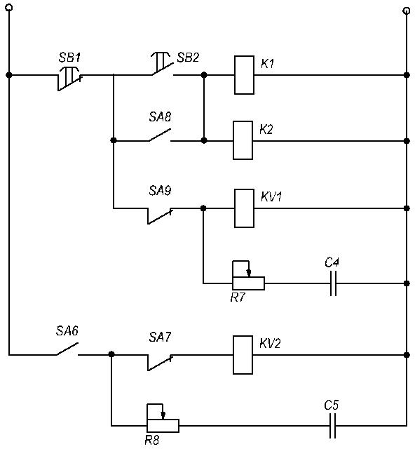 Дозвіл на пуск конвеєрів дається операторами, що стежать за роботою конвеєрів на найбільш відповідальних ділянках. Натиснення на кнопки готовності SB3 і SB4 викликає запалення сигнальних ламп ЛС1 і ЛС2 і спрацьовування реле K1 і K2. Останні готують ланцюг пускового реле K3. При натисненні на кнопку SB5 “Пуск" спрацьовує K3, яке включає контактор K4. Відбувається однофазна синхронізація положення ПЧ, Д1 і Д2. Через витримки часу маятникові реле, вбудовані в контактори K4 і K5, послідовно включається K5, відключається K4 і включається K6. Здійснюється реостатний пуск двигуна перетворювача частоти за принципом часу (реле часу K10, K11, K12).