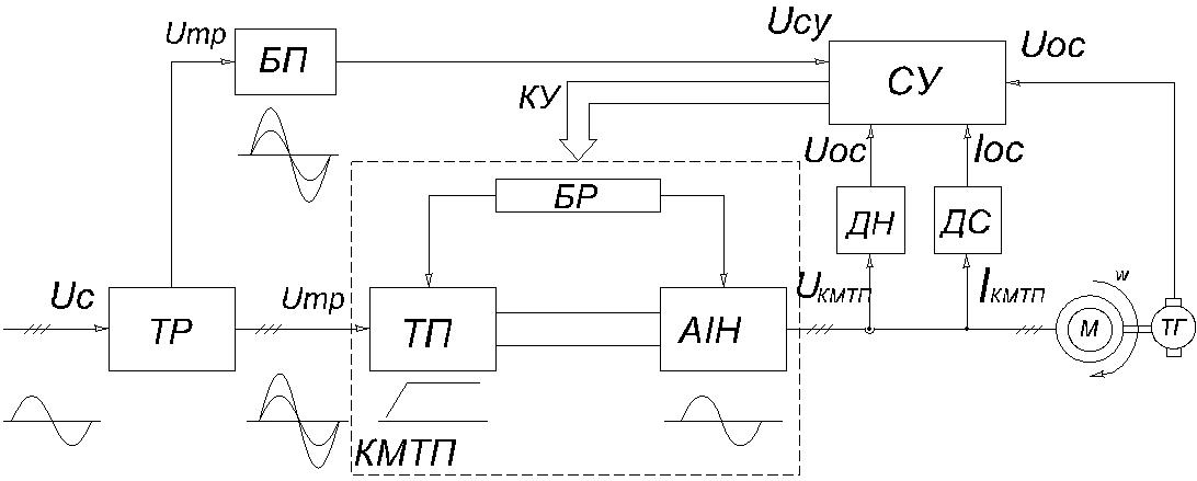 Одна з можливих схем автоматичного управління асинхронним двигуном з короткозамкнутим ротором, керованим за допомогою перетворювача тиристора частоти з автономним інвертором струму, представлена на рис.1.3 У ній силова частина перетворювача поєднується із спрощеною схемою блоку регулювання, що формує необхідний зв'язок між струмом і ковзанням в статичних і динамічних режимах. Блок побудований за принципом підлеглого регулювання.
