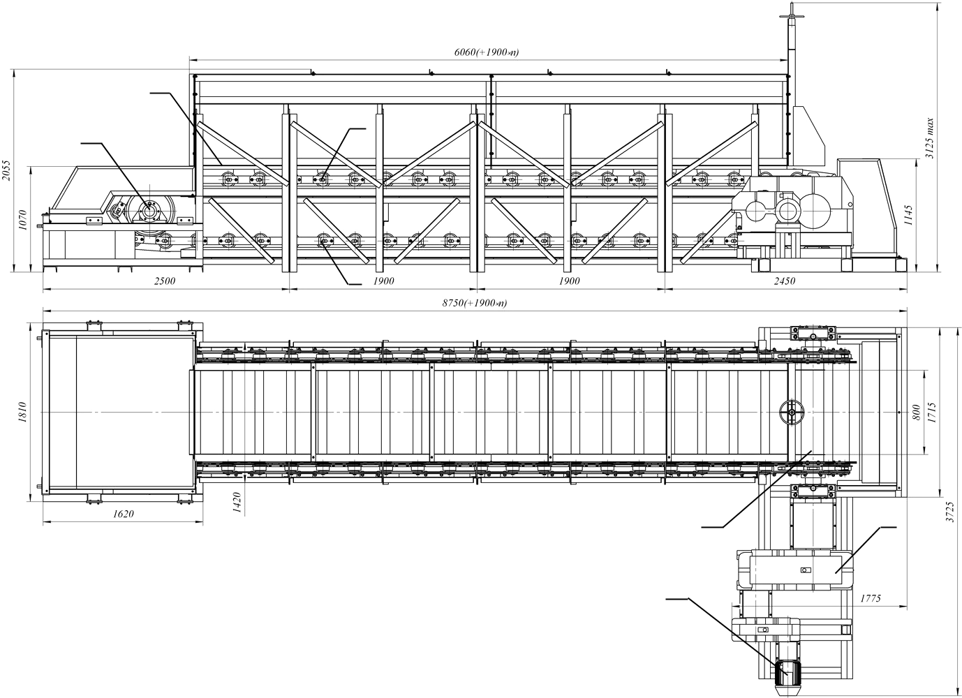 Довжина конвеєра: Номінальна, між центрами барабанів Між центрами барабанів по горизонталі |