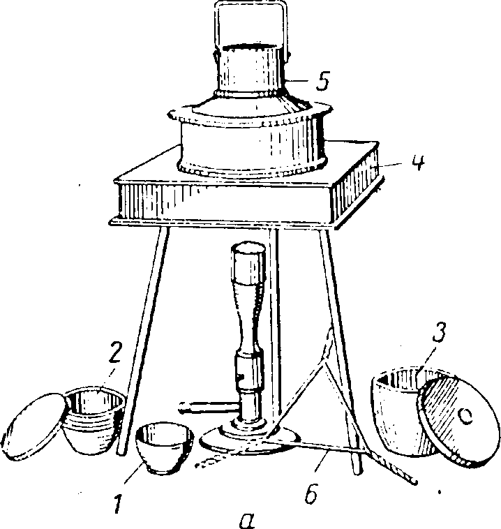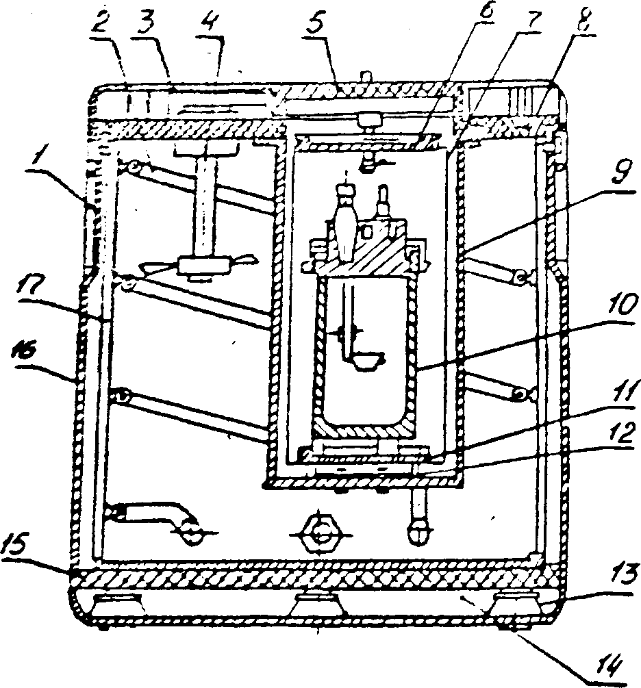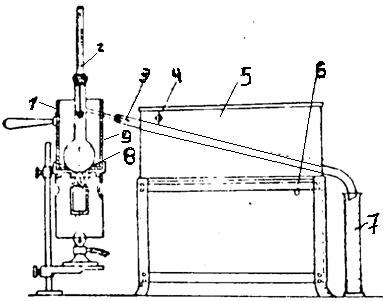 Подготовленный калориметрический сосуд закрывают крышкой и ставят в оболочку калориметра на подставку (рисунок 7). К сосуду подключают электроразьем нагревателя и два штырьковых контакта цепи зажигания. Оболочку закрывают крышкой. Ось мешалки сосуда соединяют с ведущим валом двигателя, для чего рычажок привода переводят до упора вправо.