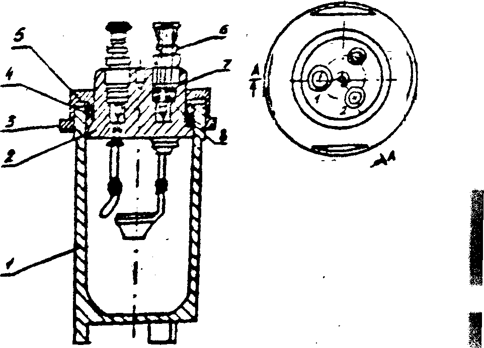 Для испытаний корпус бомбы типа I (рисунок 8) наливают дистиллированную воду. Бомбу устанавливают в подставку и медленно наполняют кислородом, не вытесняя из нее воздух. Для этого следует закрыть выходной клапан «2», а входной клапан «1» открыть ключом на половину оборота и присоединить к нему кислородопроводную трубку с накидной гайкой от стойки с манометром. После этого открывают вентиль на баллоне с кислородом и устанавливают на выходе редуктора давление 2.9 МПа (30 кгс/см2).