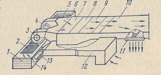 Скорость движения воздуха в нагнетательном воздуховоде исходя из допускаемого уровня шума обычно принимается 6-7 м/с (наибольшая допускаемая на отдельных участках 10-12 м/с). При таких сравнительно небольших скоростях для прохода требуемого количества воздуха поперечные сечения нагнетательного воздуховода сделаны достаточно больших размеров.