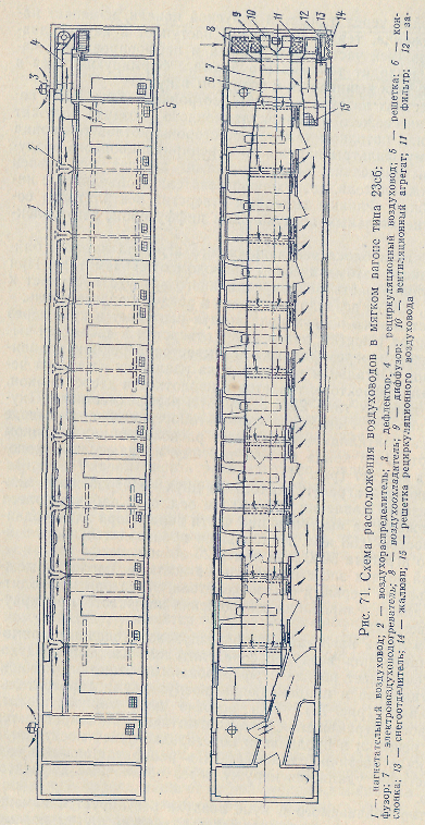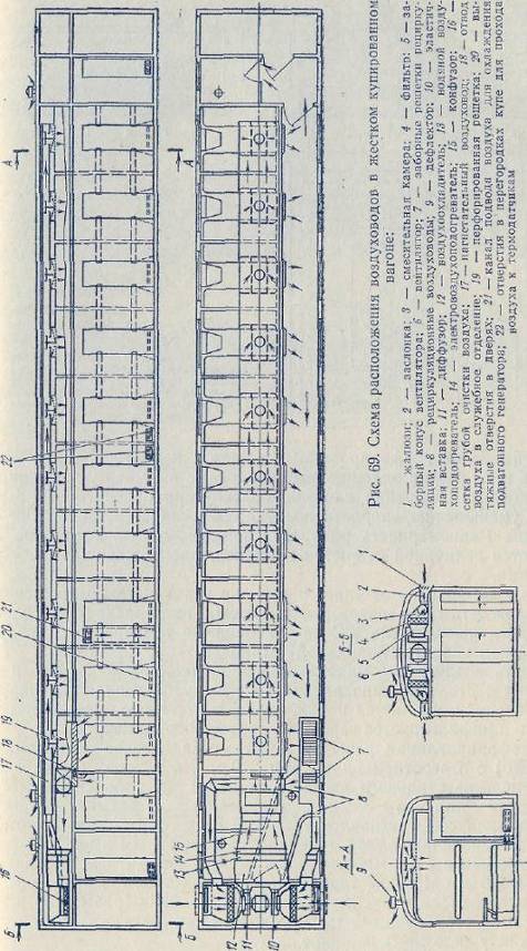 На рис. 69 показана схема расположения воздуховодов в жестком купированном вагоне постройки заводов ГДР.