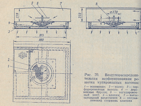 Воздуховод имеет прямоугольное поперечное сечение с закругленной по форме крыши верхней частью. По длине нагнетательного воздуховода в нижней его части в каждом купе имеются воздуховыпускные решетки, предназначенные для равномерного распределения воздуха в -помещениях для пассажиров и перемещения его с определенной скоростью.