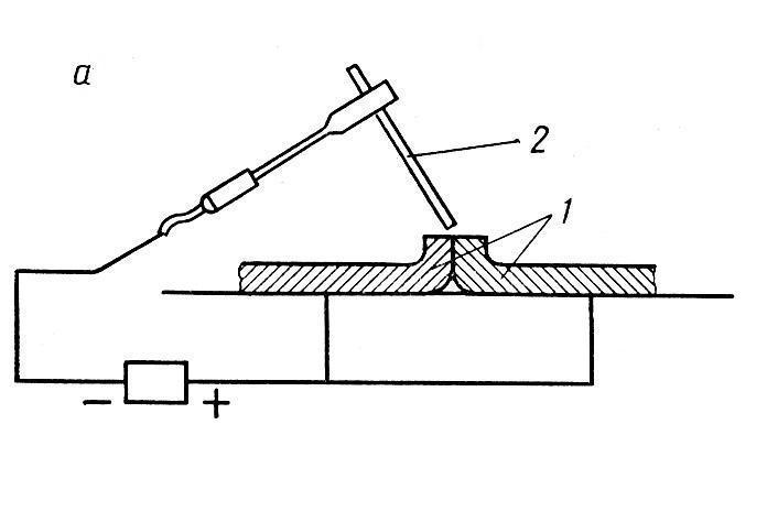 При электродуговой сварке (рис. 1, а) электрической дугой в месте контакта электрода 2 и соединяемых деталей 1 расплавляется металл деталей и электрода и образуется прочный шов. Защитная обмазка металлического электрода образует при сварке большое количество шлака и газа, которые обеспечивают устойчивое горение дуги и защищают расплавленный металл от окисления. В месте сварки сильно окисляющихся при нагреве алюминиевых и магниевых сплавов, сплавов титана, высоколегированных сталей электрическую дугу окружают слоем инертного газа, аргона или гелия, что сильно удорожает сварку.
