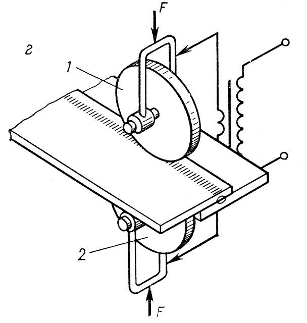 Шовную сварку (рис. 1, г) осуществляют вращающимися дисковыми электродами. При этом получается непрерывный сварной шов, обеспечивающий герметичное соединение тонкостенных деталей.