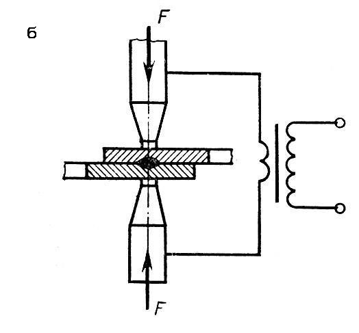 Контактная сварка – самый производительный способ сварки в массовом производстве. Различают точечную, стыковую и роликовую (шовную) контактные сварки. При точечной сварке (рис. 1, б) тонкостенные детали соединяют внахлестку. Под действием давления электродов, проводящих ток к месту сварки, образуются точечные сварные соединения. Так как высокие температуры действуют на небольших участках (точках), отсутствует коробление соединяемых деталей. Точечную сварку используют при изготовлении кожухов, панелей, шасси, стоек и других деталей.