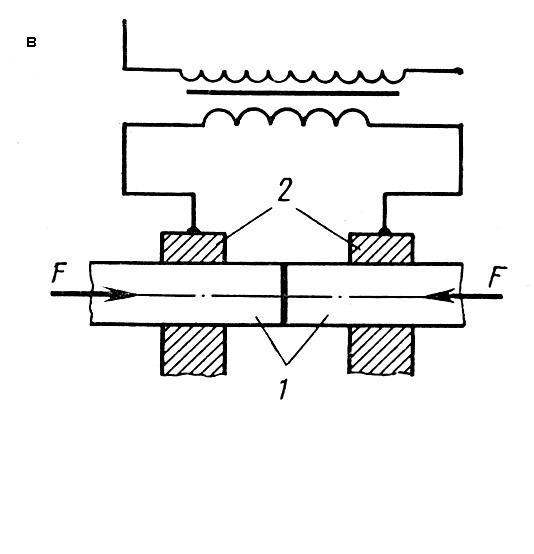 При стыковой сварке (рис. 1, в) соединяемые детали сжимают и в зоне контакта при прохождении электрического тока выделяется большое количество теплоты. Стыковой сваркой соединяют детали различных форм и сечений (круг, квадрат, труба, уголок и т.д.).