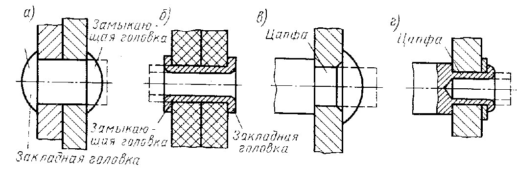 Заклепочные соединения выполняют с помощью специальных крепежных деталей – заклепок (рис. 3, а, б) или непосредственным расклепыванием цапф деталей (рис. 3, в, г).