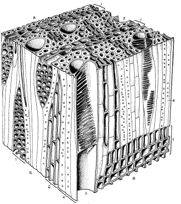 А – поперечный разрез; Б – тангентальный разрез; В – радиальный разрез: