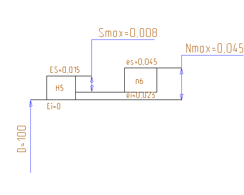 2. Выбор переходной посадки. Номинальный размер Ø100 мм. Требуется выбрать посадку, в которой обеспечивается наибольший зазор – 0,012мм, и наибольший натяг – 0,045мм: