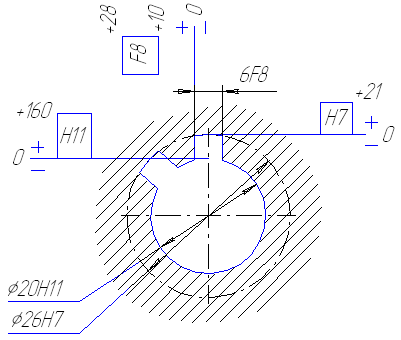 Увязываем посадку отверстия с точностью зубчатой передачи, в частности, с той нормой точности, которая является основой в оценке работоспособности передачи. Степень точности – 6 по норме контакта зубьев предполагает высоконагруженную передачу с посадкой H7/t6 колеса на вал (без шпонок). Соответственно отверстие по H7.