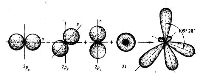 Когда углерод, проявляя валентность четыре, соединяется простыми (ординарными) связями с четырьмя другими атомами, электронная плотность облаков всех четырех валентных электронов перераспределяются. Происходит гибридизация одного s- состояния и трех p- состояний электронов. В результате во внешнем электронном слое связанного углеродного атома возникают четыре одинаковых гибридных состояния. Занимая эти состояния, валентные электроны образуют гибридные облака, имеющие вид деформированной восьмерки (Рис.3 д), большая часть которой направлена от ядра по линии связи с другим атомом.