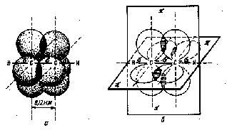 Таким образом, у атома углерода, участвующего в образовании четырех ковалентных связей, во внешнем электронном слое, как было показано ранее, четыре валентных электрона. Состояние их не одинаково. Один из них (s- электрон), двигаясь вокруг ядра образует шаровое облако (рис.3), подобное облаку электрона в атоме водорода (s-состояние электрона). Облака трех других электронов (p- электроны) имеют форму объемных восьмерок (гантелей) с "перетяжкой" в области ядра и ориентированных в трех взаимно перпендикулярных направлениях (p- состояния электрона).