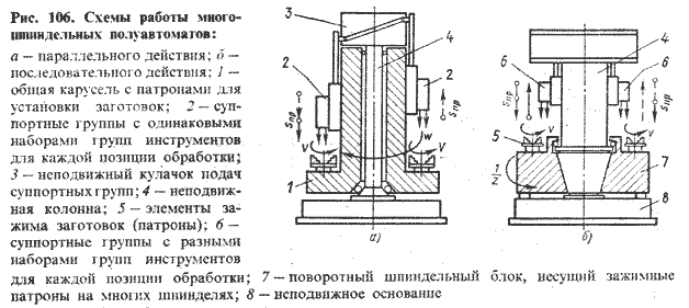 Одна из позиций полуавтомата является загрузочной, а в других ведется обработка поверхностей заготовки: всех (полуавтоматы параллельного действия) или части их (полуавтоматы последовательного действия). Каждая рабочая позиция обслуживается группами поперечных и продольных суппортов, причем последние могут быть объединены в единую конструкцию с одним приводом подачи. В ряде позиций на продольных суппортах устанавливаются инструментальные головки с отдельным приводом главного движения. Заготовки зажимаются гидравлически в кулачковых или цанговых патронах.