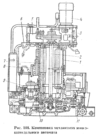 Нижний блок на чашеобразном основании 11 содержит синхронизаторы 10. Они обеспечивают безударное соединение шпиндельной группы с главным приводом после каждого поворота шпиндельного стола, поскольку шпиндели должны иметь частоту вращения той рабочей позиции, куда они поступили.