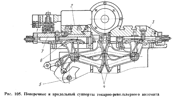Суппорты 3 и 7 автомата (рис. 105) перемещаются от реек, приводимых в поступательное движение зубчатыми секторами 4 и 6 по прямоугольным направляющим станины 6 (см. рис. 102) или кронштейнов верхней передней части шпиндельной бабки 3 автомата. Зубчатые секторы получают движение от распределительного вала 5 с кулачками (рис. 105).; Горизонтальные (нижние) суппорты имеют повышенную жесткость в сравнении с вертикальными и служат для выполнения наиболее нагруженных операций обработки. На вертикальных суппортах выполняют отрезку детали, проточку мелких канавок, снятие фасок и т.п. Передний горизонтальный суппорт 7 несет на себе продольный суппорт 2, что расширяет возможности автомата. Он перемешается по продольным направляющим параллельно оси шпинделя при продольной обточке. На переднем поперечном суппорте имеются копирные планки, между которыми перемещается ролик 1 приспособления для проточки конусов или простейших фасонных поверхностей.