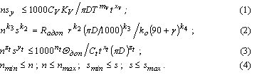 где D – диаметр обработки; CV, KV – коэффициенты и xv, yv, m – показатели, характеризующие степень влияния глубины t, подачи s и стойкости T на скорость резания v; k0, k1, k2, k3, k4 – коэффициент и показатели, характеризующие степень влияния подачи s, радиуса при вершине r и скорости резания v на шероховатость обработанной поверхности Ra; Ct – постоянный коэффициент и xt, yt, zt – показатели степени, характеризующие степень влияния глубины резания t, подачи s и скорости резания v на температуру резания; определяемым кинематической структурой привода главного движения и привода подач.