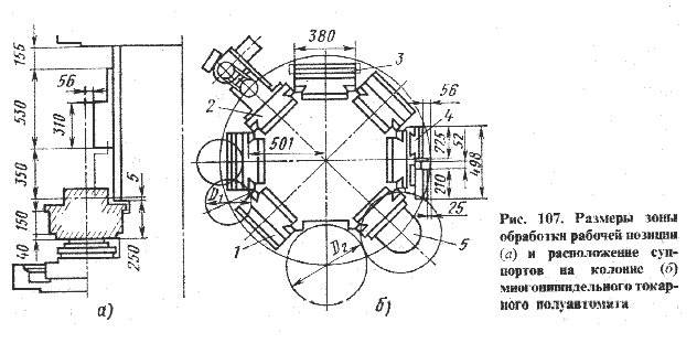 Рабочее пространство станка (рис. 7) включает восемь секторов-позиций. Каждую из позиций, кроме загрузочной, можно рассматривать как станок, связанный с другими управлением, базовыми деталями, общим приводом. На станке используется пять основных типов суппортов: вертикальный 1, с расточной головкой 2, универсальный 3, параллельного действия 4 и с приводом сверлильной головки 5. Кроме того, имеются специальные суппорты и многошпиндельная сверлильная головка. Суппорты монтируются на направляющих колонны в соответствии с технологическим процессом обработки конкретной заготовки (или заготовок).