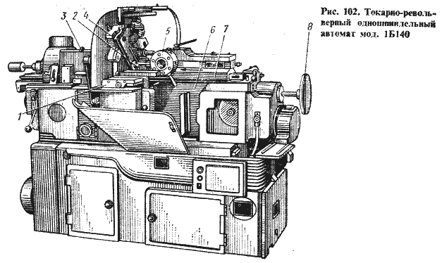 Рассмотрим автомат мод. 1Б140 (рис. 102), предназначенный для изготовления в массовом и крупносерийном производстве деталей, требующих обтачивания, подрезания торцов, сверления, зенкерования, нарезания резьбы и т.п. Загрузка нового прутка длиной до 3000 мм осуществляется вручную, а в процессе работы автомата подача и зажим прутка, как и другие холостые и рабочие ходы, осуществляются автоматически.